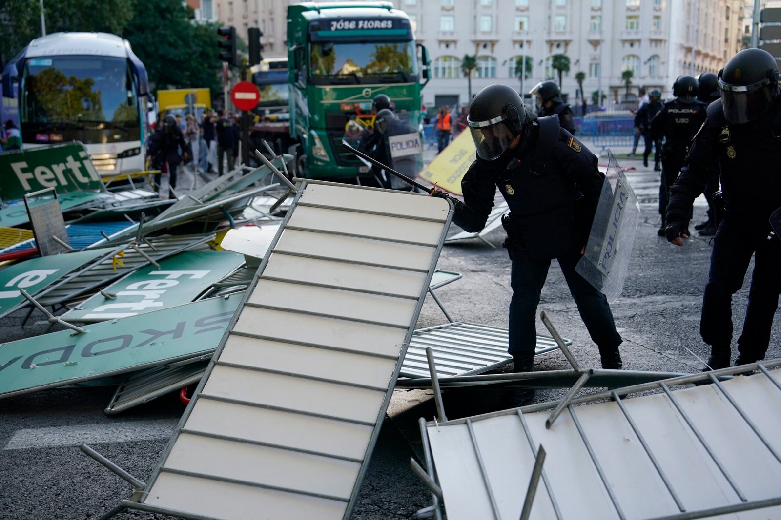 Manifestantes derrubaram barreiras metálicas e ocuparam o percurso do campeonato em vários pontos de Madrid, enquanto a polícia tentava contê-los.