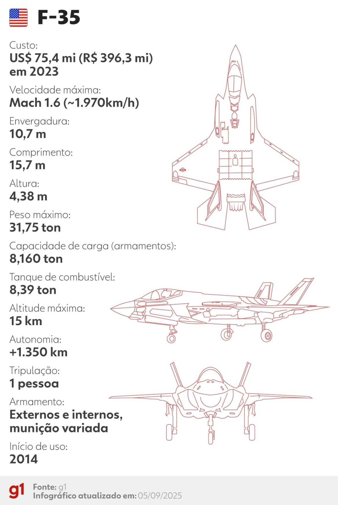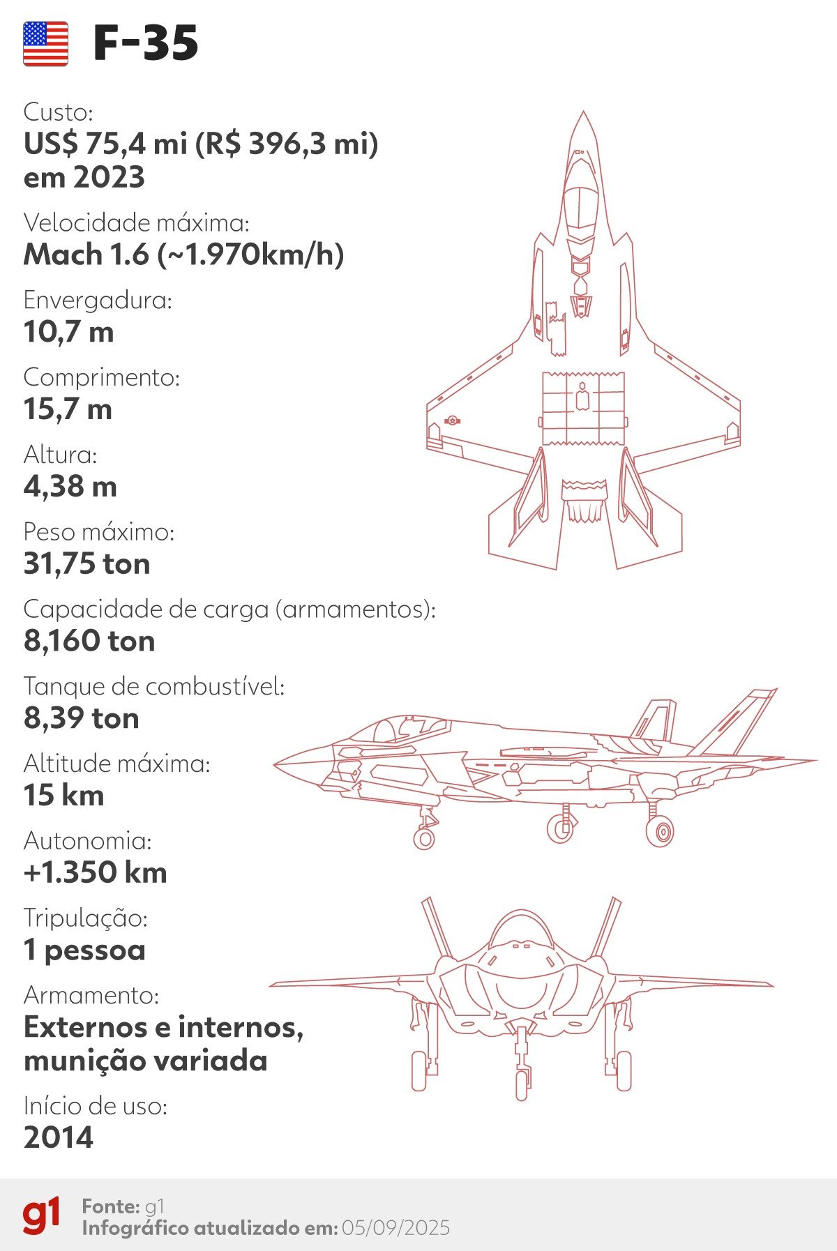 Os EUA operam o F-35A Lightning II. De acordo com a própria Força Aérea americana, trata-se de “um caça multifuncional ágil, versátil, de alto desempenho e com capacidade para 9g que combina furtividade, fusão de sensores e consciência situacional sem precedentes”.
