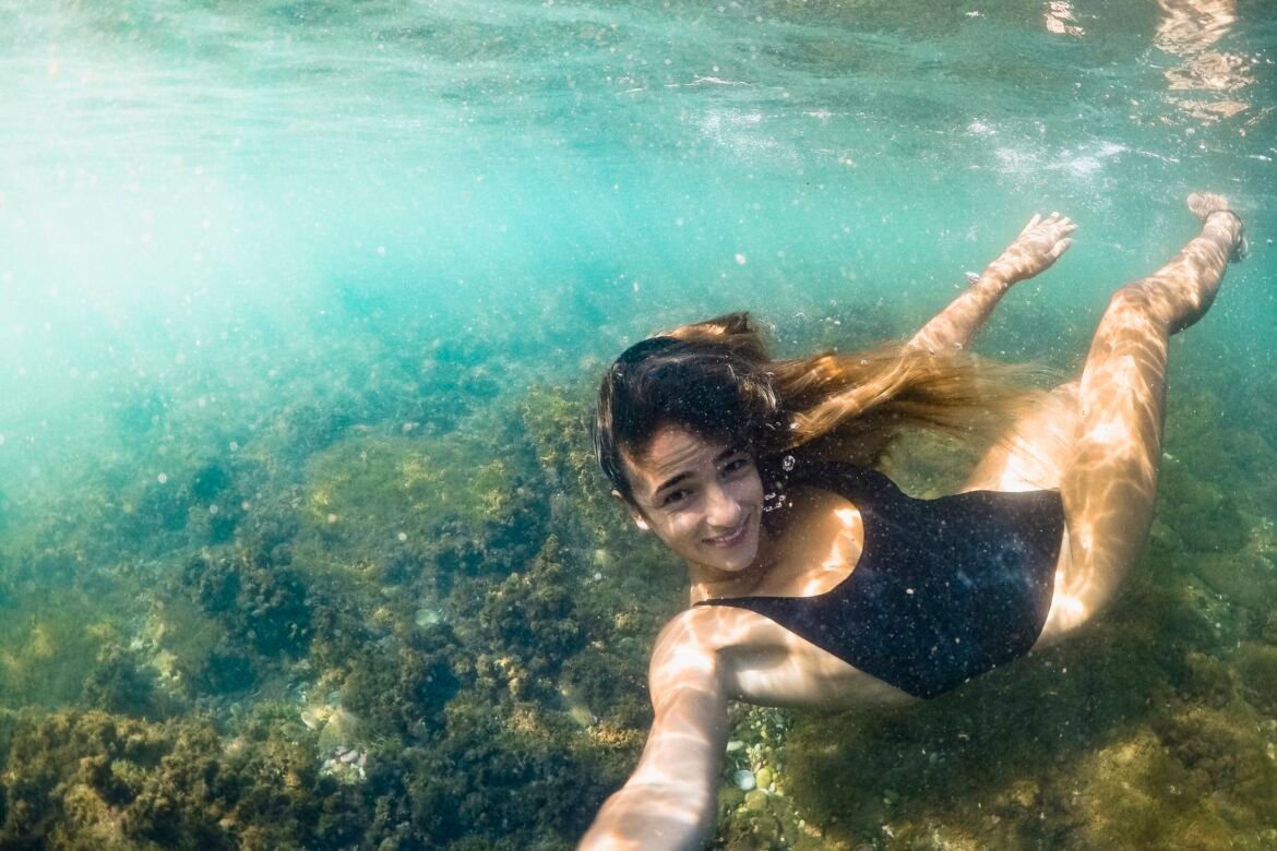 Mulher fotografada embaixo d’água