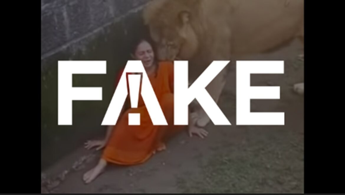É #FAKE que vídeo mostre leão cheirando mulher que teria caído em jaula na Índia; cena foi criada com IA