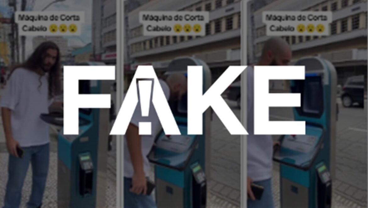Circula nas redes sociais um vídeo que mostra um homem cortando os cabelos em um “totem” de atendimento automático em uma calçada. É #FAKE.