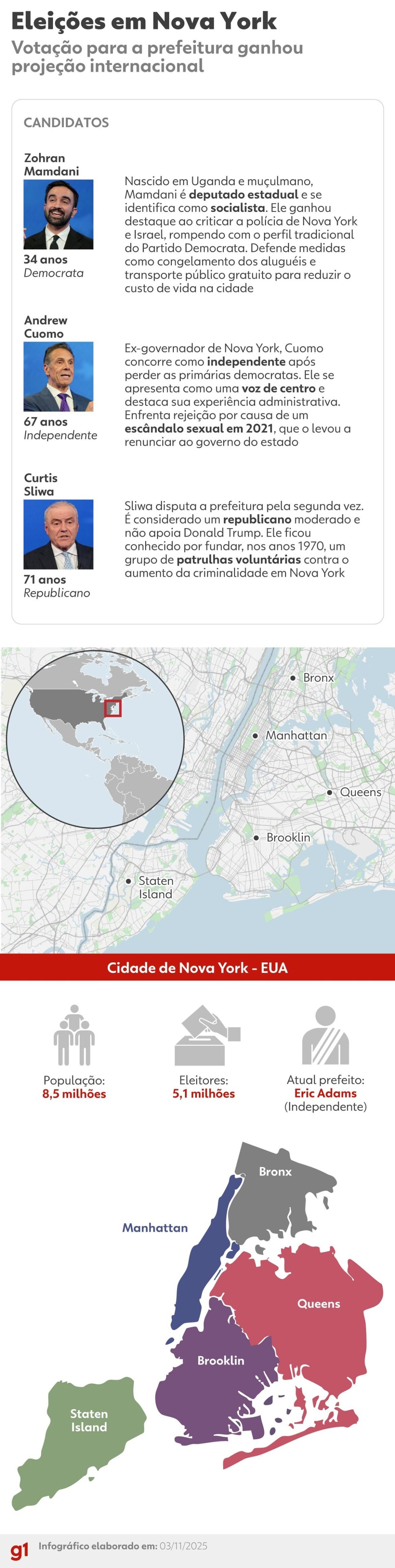 A cidade de Nova York vai às urnas nesta terça-feira (4) para escolher o próximo prefeito. Com o muçulmano e democrata Zohran Mamdani como favorito, o pleito ganhou projeção internacional e se transformou em uma disputa política nacional diante de ameaças do presidente dos Estados Unidos, Donald Trump.