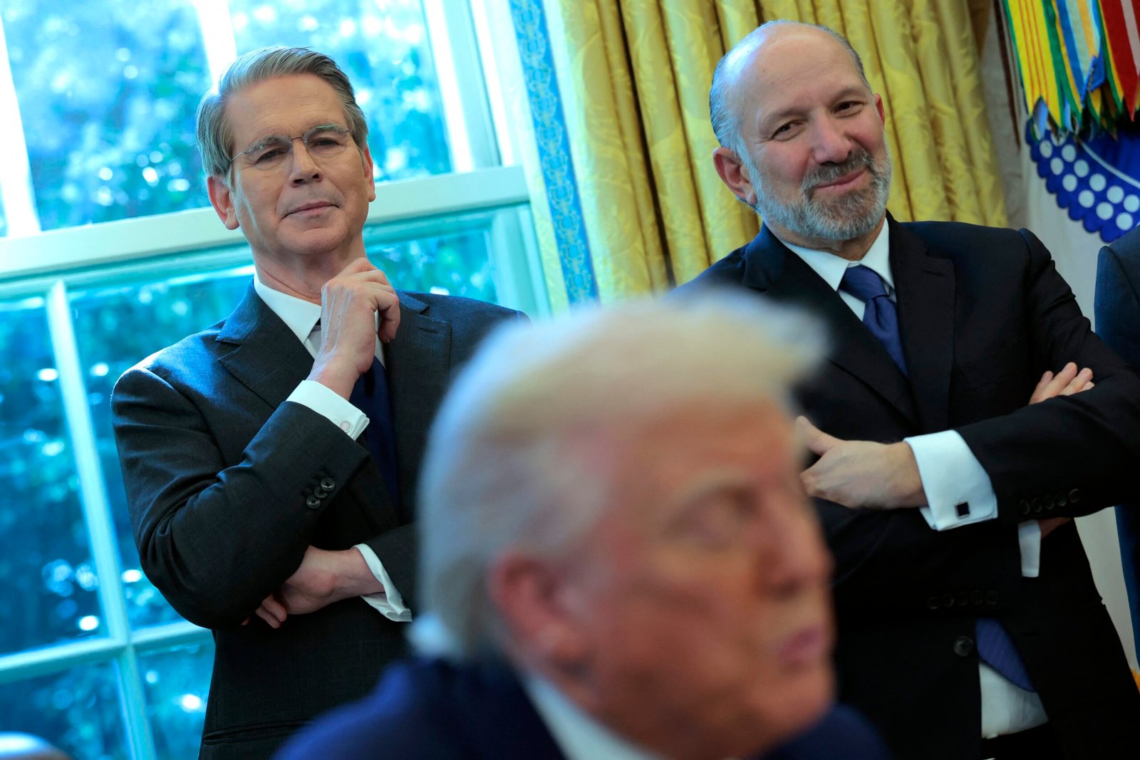 Secretário do comércio Howard Lutnick e secretário da tesouraria Scott Bessent no Salão Oval.