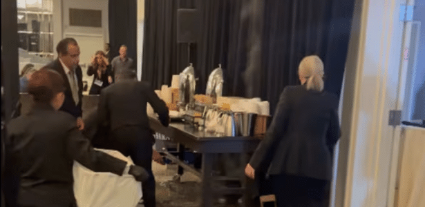 No registro, funcionários tentam conter a fumaça que saía de um aquecedor na área de alimentação da sala. Outras pessoas puxavam a cortina preta perto da área para impedir que as chamas se espalhassem.