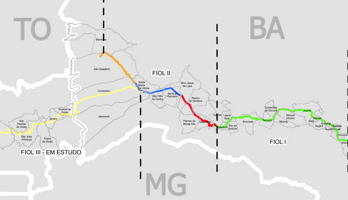 Com aproximadamente 1527 km de extensão, a Ferrovia de Integração Oeste Leste (Fiol_ ligará o futuro porto de Ilhéus (no litoral baiano) a Figueirópolis (em Tocantins), ponto em que se conectará com a Ferrovia Norte-Sul.