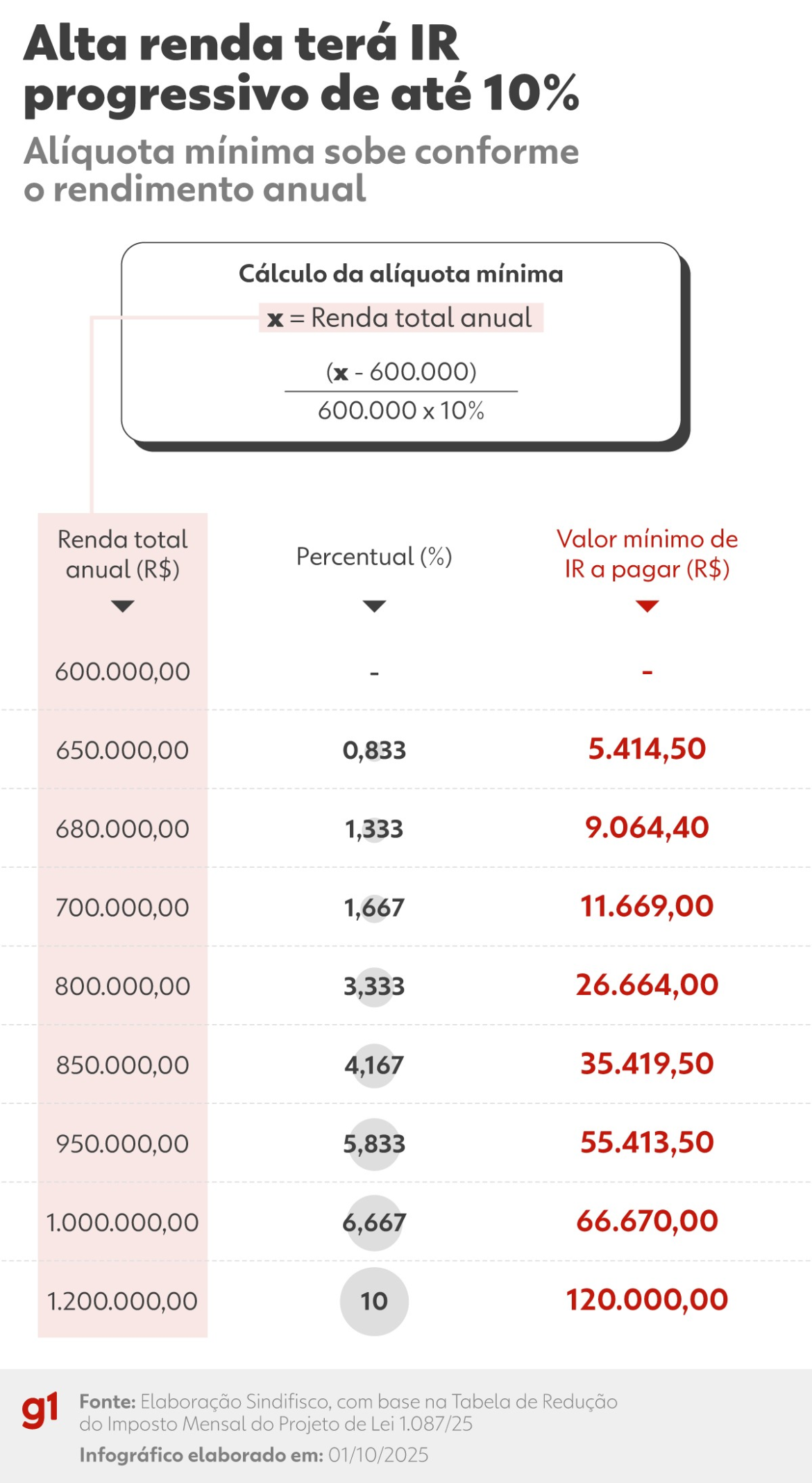 Um profissional com renda de R$ 50.001 mensais, que não seja tributado pelo IRPF, pagará R$ 501; assim como um profissional de renda R$ 100.001 mensais, pagará R$ 10.001 de Imposto de Renda.