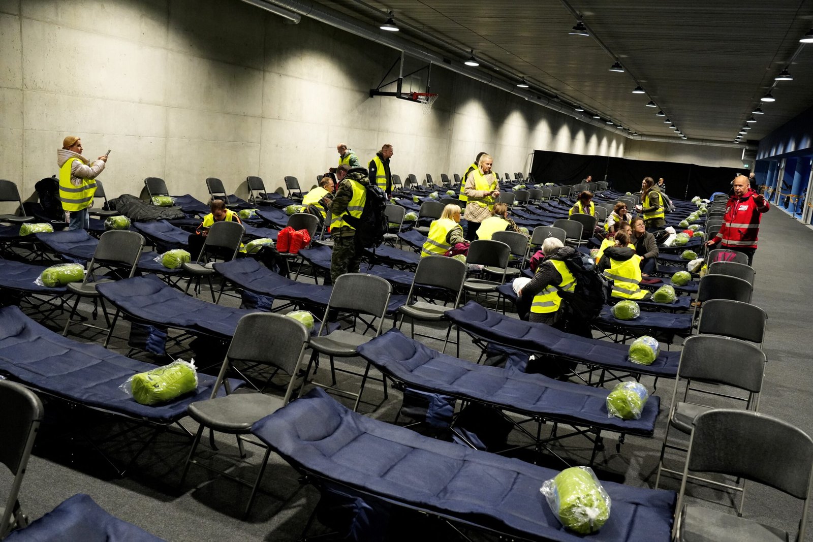 Governo da Lituânia faz exercício de treinamento de evacuação em caso de guerra. Voluntários vestindo coletes se acomodam em camas improvisadas. em ginásio de atletismo em Kaunas, a cerca de 80 km da capital Vilnius, em 7 de outubro de 2025.