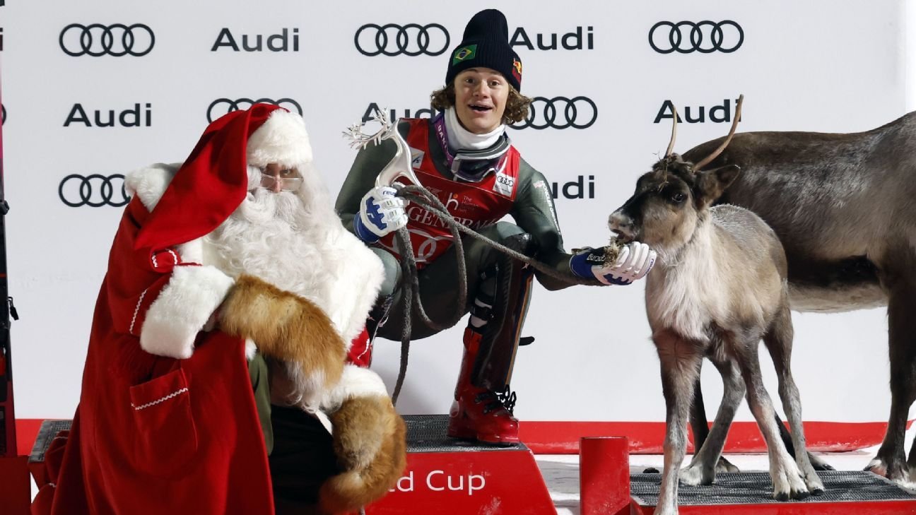 Já é Natal? Papai Noel e renas ‘invadem’ pódio após título do Brasil na Copa do Mundo de Ski Slalom