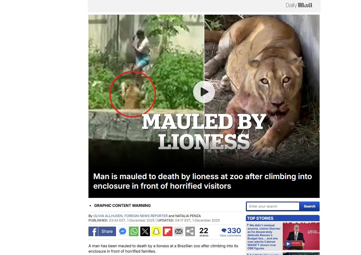 Os jornais estrangeiros deram destaque à peculiaridade do ataque e à altura que o homem teve que escalar para entrar na jaula da leoa. Além disso, também deram destaque às imagens do ataque, chamadas de “horripilantes” pelo tabloide “Daily Mail”, e mencionaram o choque dos visitantes do parque que presenciaram a cena. Veja abaixo:
