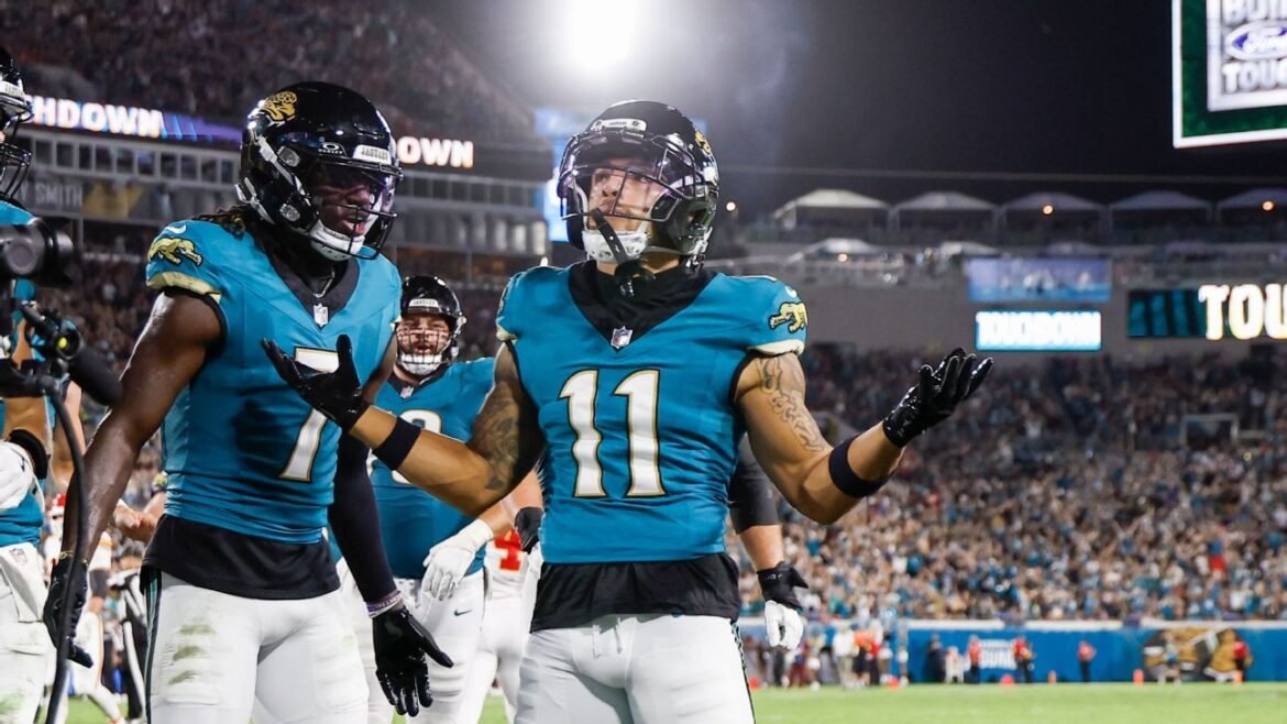 Os Jaguars conseguiram responder ainda no primeiro tempo. Primeiro, quase chegaram ao touchdown, mas sofreram um fumble praticamente na linha da endzone ao tentarem saltar sobre a defesa adversária, Depois, após uma longa campanha de 18 descidas em mais de oito minutos, Trevor Lawrence encontrou Parker Washington no cantinho da endzone, para alívio da torcida presente no EverBank Field.
