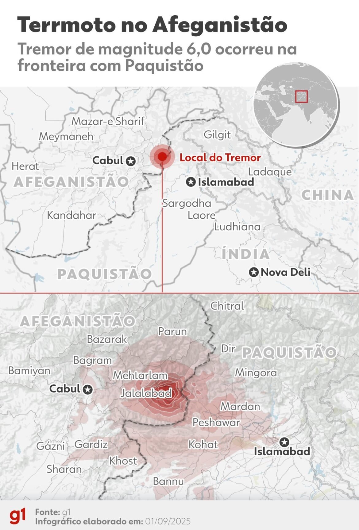 Mapa mostra região atingida por terremoto de magnitude 6,0, em 1º de setembro de 2025.