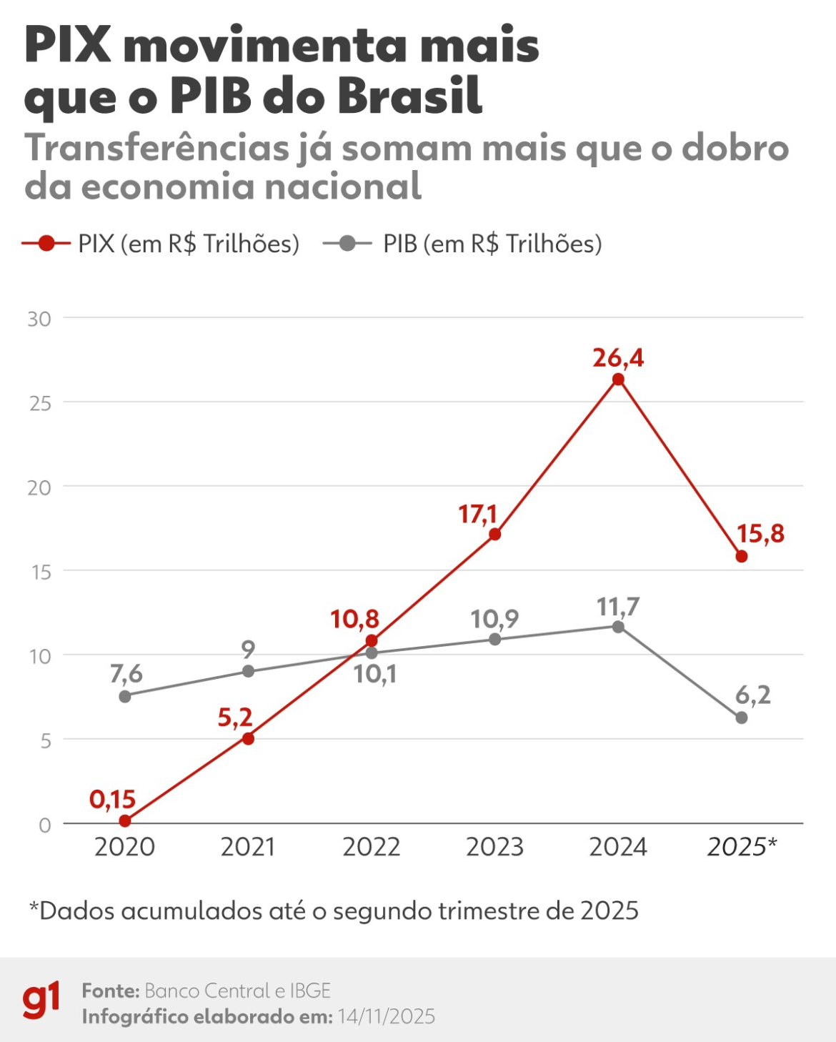 O tamanho do crescimento aparece nos números: só em 2024, o PIX movimentou mais de R$ 26 trilhões — valor equivalente a quase dois PIBs e meio do Brasil. Veja abaixo: