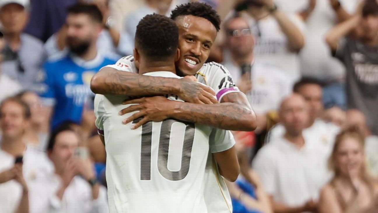 De tanto insistir, o Real abriu o placar com um golaço aos 22 minutos: Militão surpreendeu a todos ao arrancar com a bola da intermediária e soltou um “míssil” na gaveta do Espanyol.