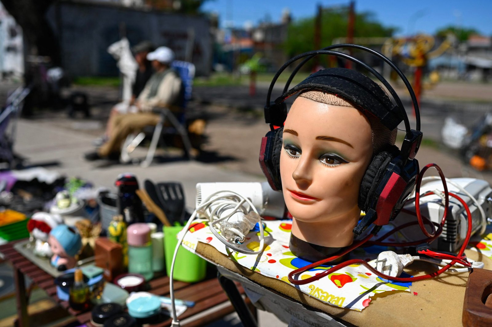 Itens de segunda mão são expostos para venda em um mercado de rua em Villa Fiorito, nos arredores de Buenos Aires.