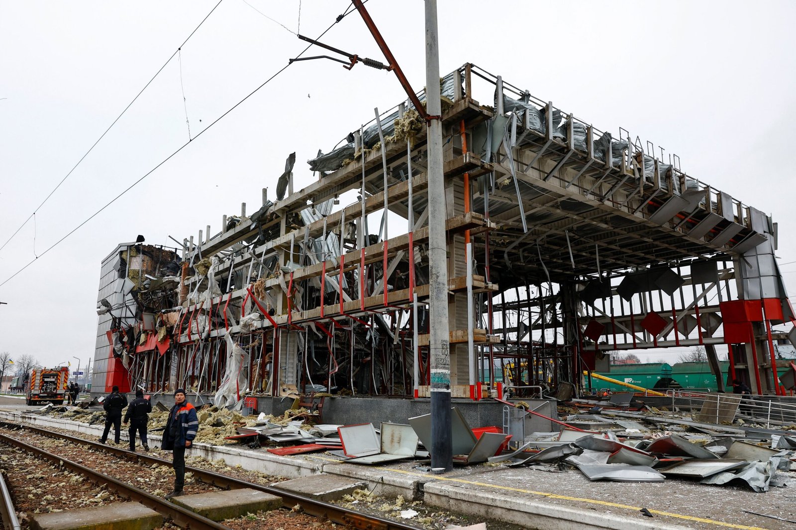 Um funcionário ferroviário observa ao lado de um prédio da estação atingido durante ataques noturnos de mísseis e drones russos na cidade de Fastiv, durante o ataque da Rússia à Ucrânia, na região de Kiev