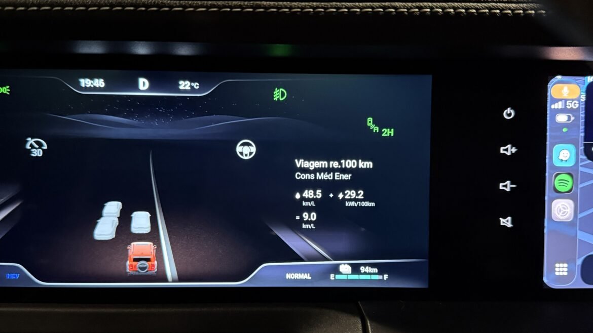 Nesse cenário, que favorece o motor elétrico e mantém o motor a combustão desligado, o consumo ultrapassou 40 km/l e chegou a 48,5 km/l — consumo que se esperaria de uma moto Honda CG 160, não de um carro com aerodinâmica e peso de pouco mais de duas toneladas.