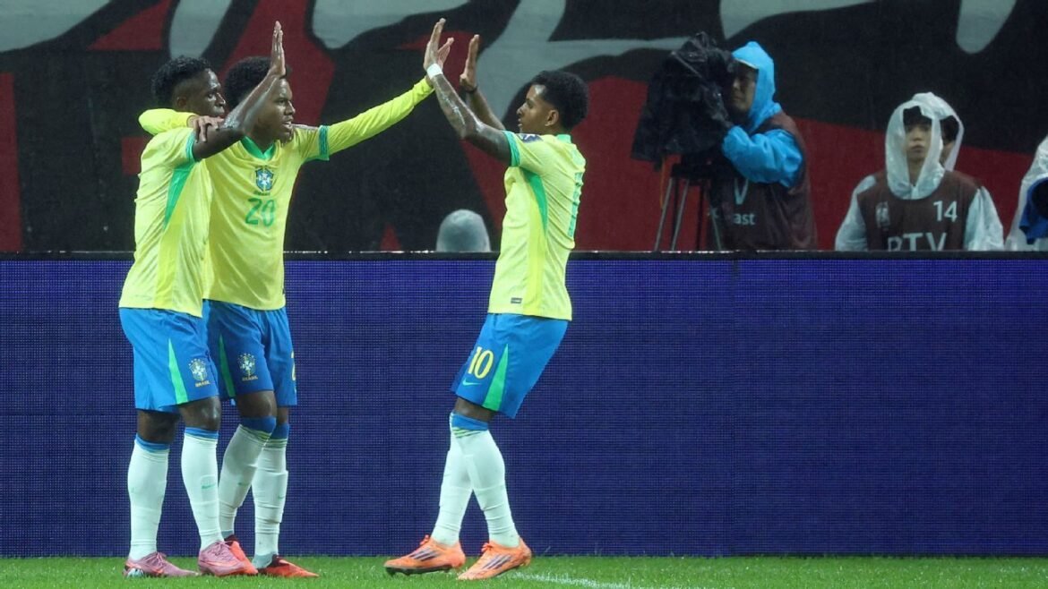 A seleção brasileira não deu chances para a Coreia do Sul e atropelou por 5 a 0, em amistoso realizado no Seoul World Cup Stadium, na manhã desta sexta-feira (10). Estêvão e Rodrygo foram os grandes nomes do confronto com dois gols cada. Nos minutos finais, Vinicius Jr. marcou o quinto. Esta foi a primeira goleada do Brasil sob o comando do técnico Carlo Ancelotti.